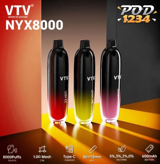 VTV NYX 8000 Puff ราคาส่ง เป็น พอตใช้แล้วทิ้ง ที่มีรูปทรง หรูหรา ดูเทสุดๆ สามารถสูบได้มากถึง 8000 ครั้ง เป็นแบตในตัวขนาด 600mAh ชาร์จได้ด้วยสาย USB Type – C ชาร์จไว แบตเต็มเร็ว และ ตัวเครื่อง VTV NYX 8000 ครั้ง จะมีน้ำยาบรรจจุในตัวเครื่องขนาด 15ml พร้อมใช้งาน มีปริมาณ สารนิโคติน อยู่ที่ 20mg – 50mg หรือ 2% – 5% แถมยัง มีรสชาติให้เลือกมากมายถึง 18 รสชาติ ให้กลิ่นหอม รสชาติหวานชัดเจน เต็มปอดไวสุดๆ ราคาถูกมากๆ ห้ามพลาดเลย